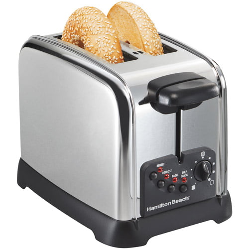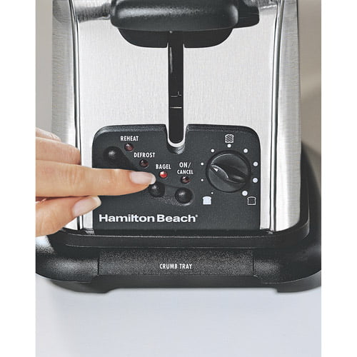 The Hamilton Beach Classic Chrome 2-Slice Toaster is designed for style and function. Features of the Hamilton Beach 2-Slice Toaster include bagel, defrost, reheat and cancel buttons, as well as a handy shade selector to suit your personal taste. The extra-wide slots on the Hamilton Beach Toaster are specially designed for bagels or homemade bread, and automatic shut-off helps prevent over-toasting. This Hamilton Beach 2-Slice Toaster also has an easy-clean crumb tray and toast boost for your convenience. The Hamilton Beach Toaster will make an ideal gift for newlyweds, college students or anyone who loves toasted bagels.