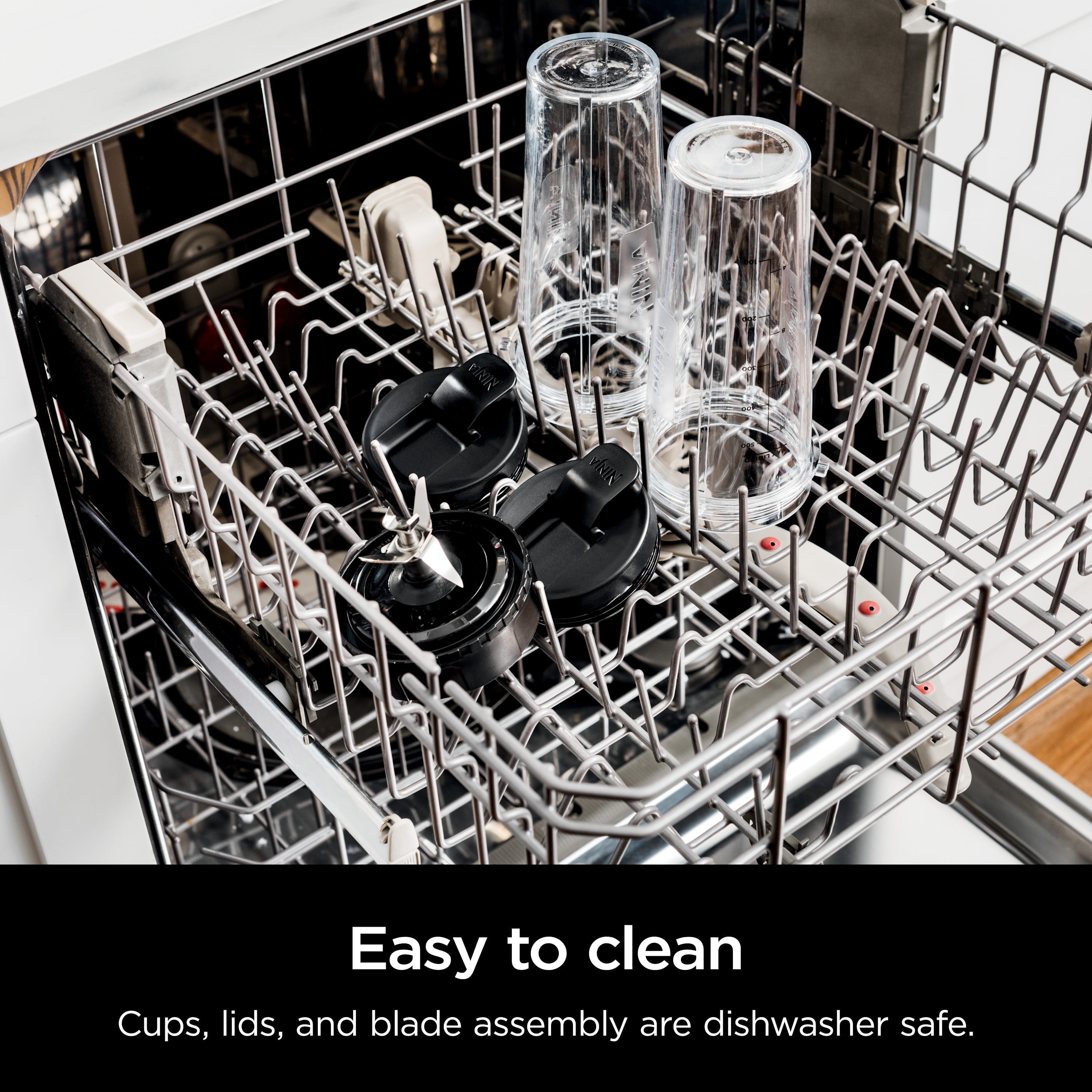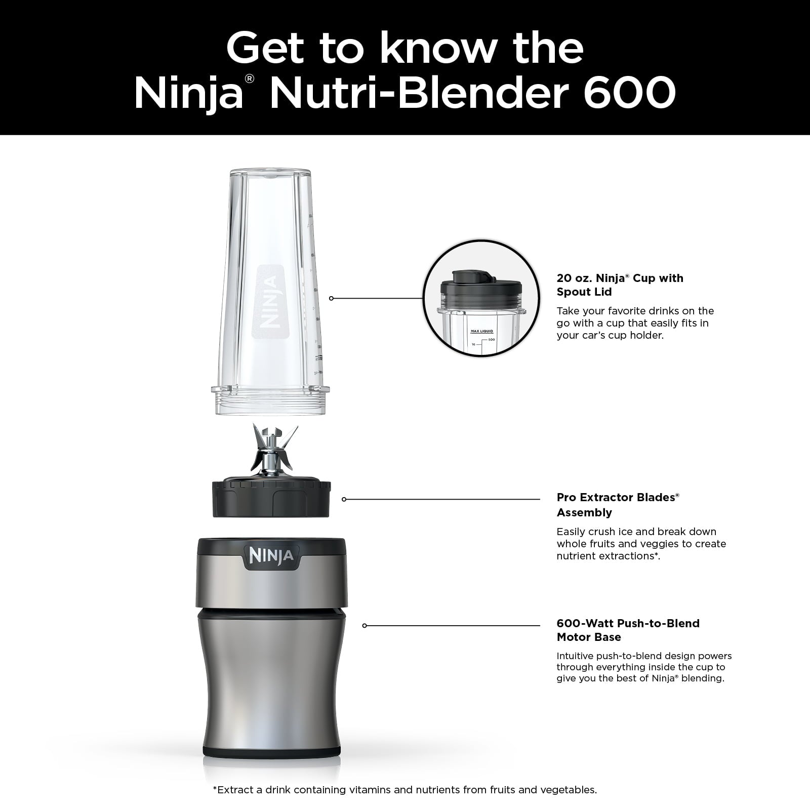 Ninja® Nutri-Blender BN300WM 600-Watt Personal Blender, 1 Dishwasher-Safe To-Go Cup The intuitive 600-watt push-to-blend motor base powers through everything inside the cup to give you the best of Ninja blending. Pro Extractor Blades Assembly easily crushes ice and breaks down whole fruits and veggies to create nutrient extractions*. *Extract a...