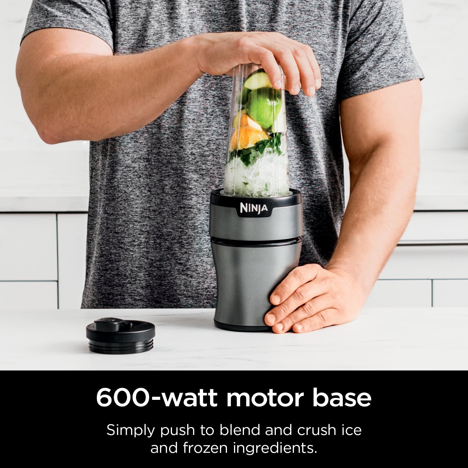 - The intuitive 600-watt push-to-blend motor base powers through everything inside the cup to give you the best of Ninja blending.