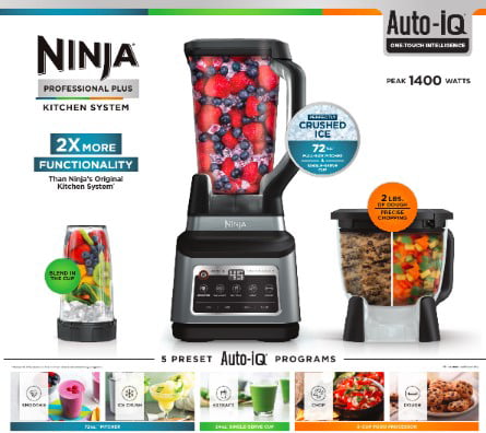 • The Ninja Professional Plus Kitchen System with Auto-iQ features a new modern design and more functionality than Ninja's original Professional Kitchen System.* *Versus BL770, based on the number of available blending programs