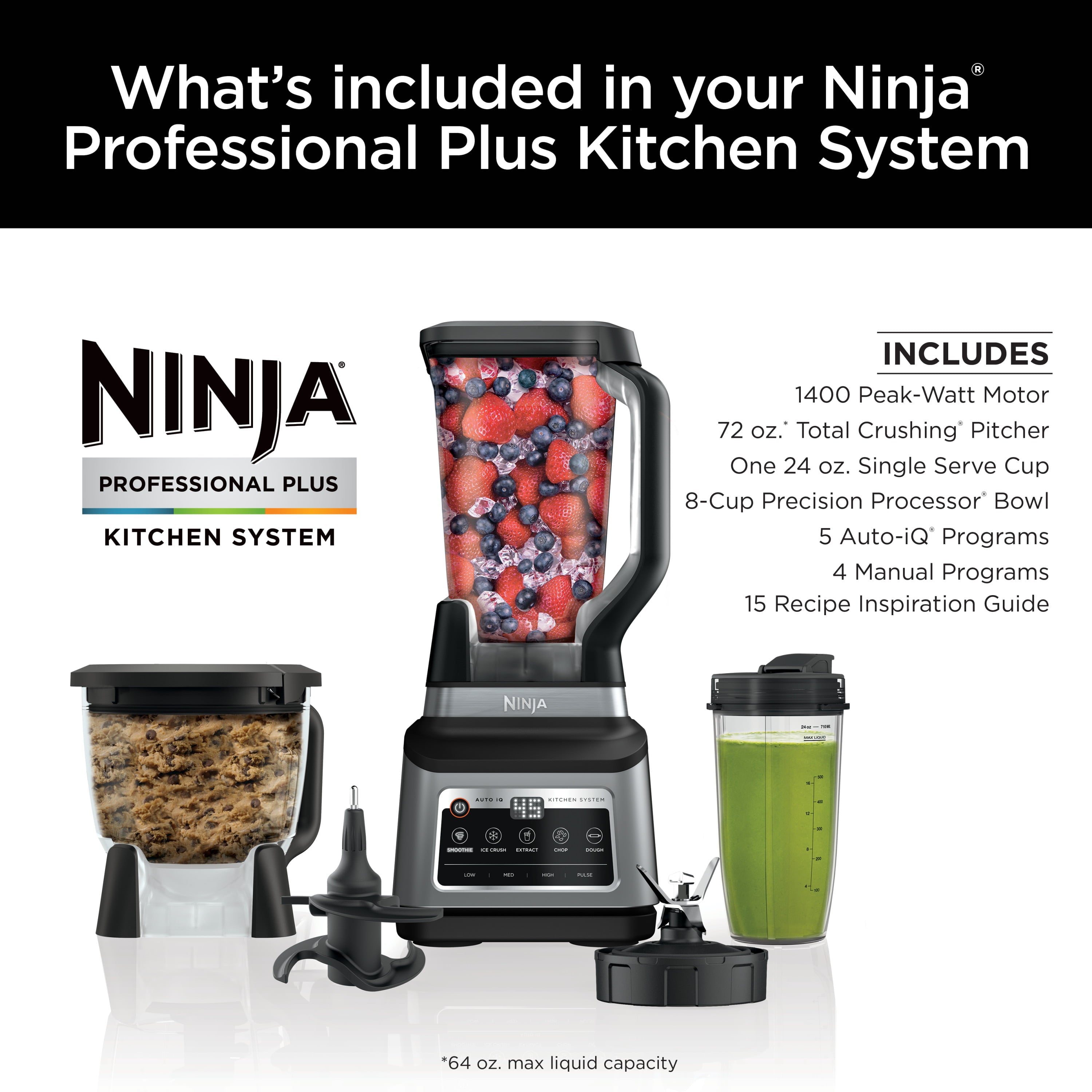 The Ninja® Professional Plus Kitchen System with Auto-iQ® features a new modern design and more functionality than Ninja's original Professional Kitchen System.* Ninja Total Crushing® Blades and Pro Extractor Blades® Assembly give you perfectly crushed ice for your smoothies, frozen drinks, and nutrient extractions**. The 72 oz.† Total Crushing Pitcher is great for making large batches for the whole family with 1400 peak watts of professional power. Plus, its single-serve cup with spout lid makes it easy to take delicious, nutrient-rich smoothies on the go. But don’t just stop at drinks—the 64 oz. processor bowl provides precision processing for even chopping, smooth purees, and up to 2 lbs. of dough. Auto-iQ Technology provides preset programs that do the work for you, no guesswork required. *Versus BL770, based on the number of available blending programs **Extract a drink containing vitamins and nutrients from fruits and vegetables †64 oz. max liquid capacity