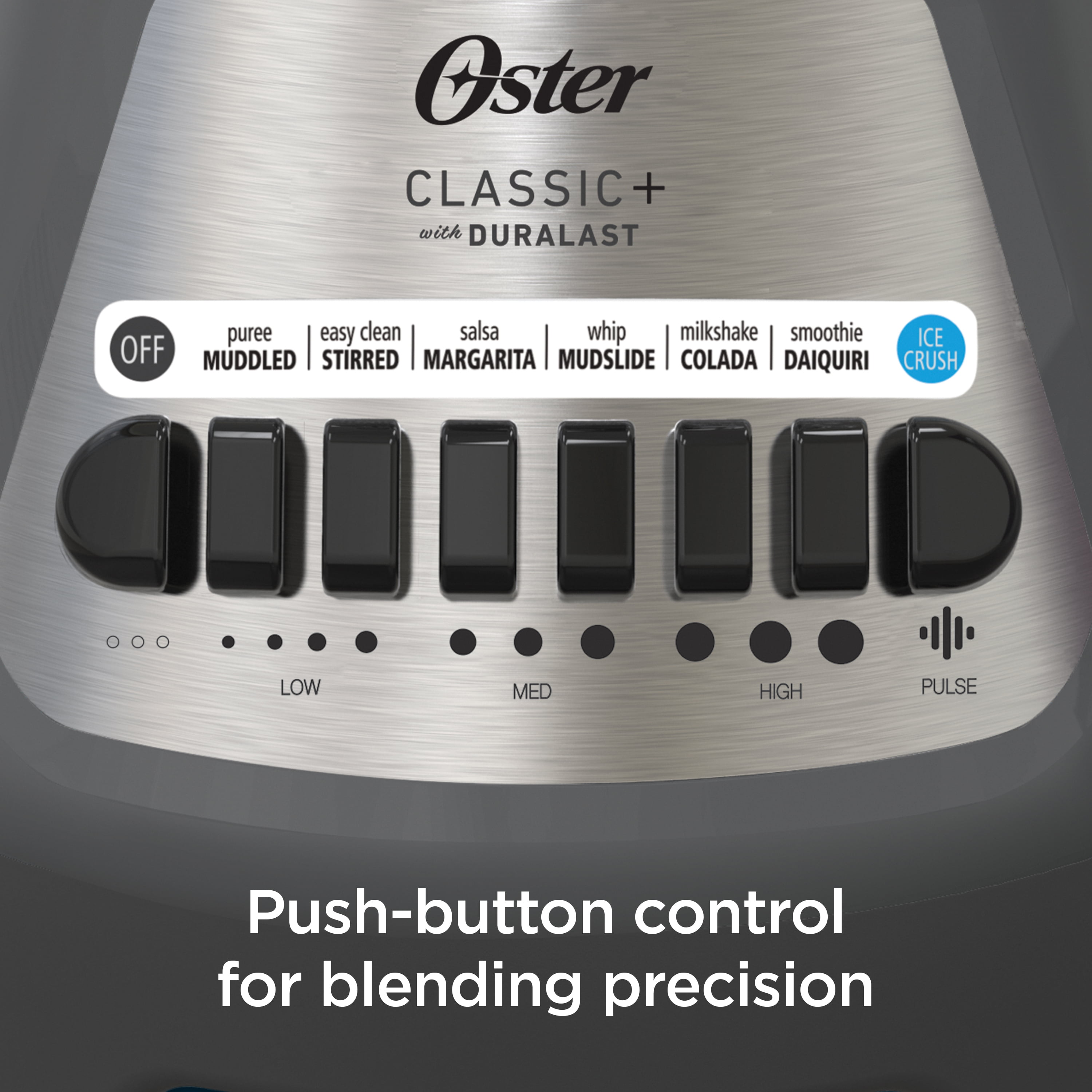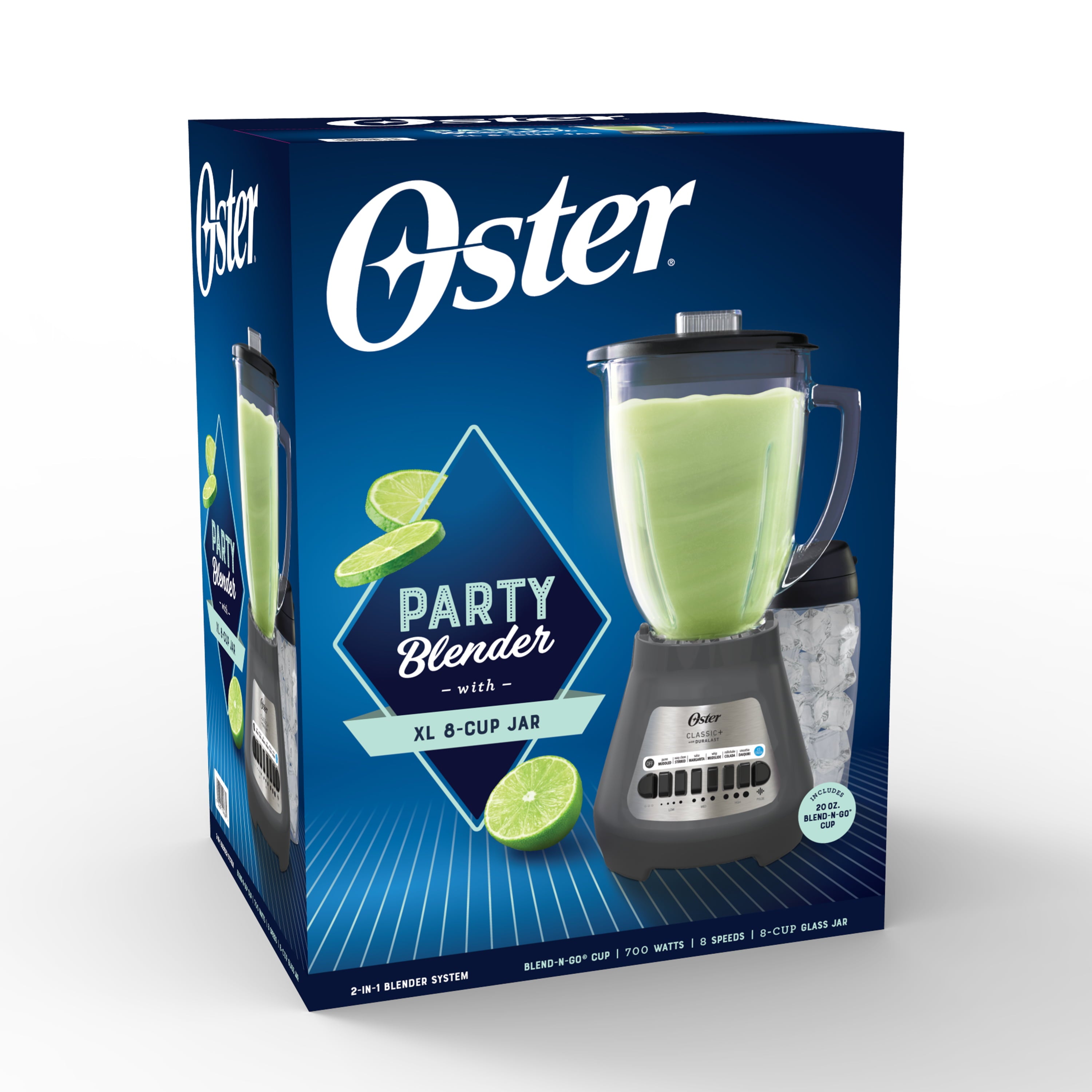 The new Oster Party Blender is perfect for creating delicious frozen drinks. Your guests will love your expertly blended margaritas, Pina Coladas, and festive frozen cocktails. When you're not entertaining, use it to make creamy smoothies, protein shakes, salsas, soups, baby food, dressings, and more. The XL 8-cup glass jar is big enough for serving large groups, while the included 20-oz. BPA-free Blend-N-Go Cup is perfect for single portions. Designed with 8-speed push-button settings, it's easy to get your meals and drinks blended just the way you like them. Its powerful 700-watt motor crushes ice effortlessly, while its stainless steel 4-point blade chops and grinds even the most challenging of ingredients with ease. The glass blender jar, Blend-N-Go Cup, and blade are all dishwasher-safe, so cleanup is a breeze. Whether you're blending for yourself or a crowd, this Oster blender will make an ideal addition to your kitchen.