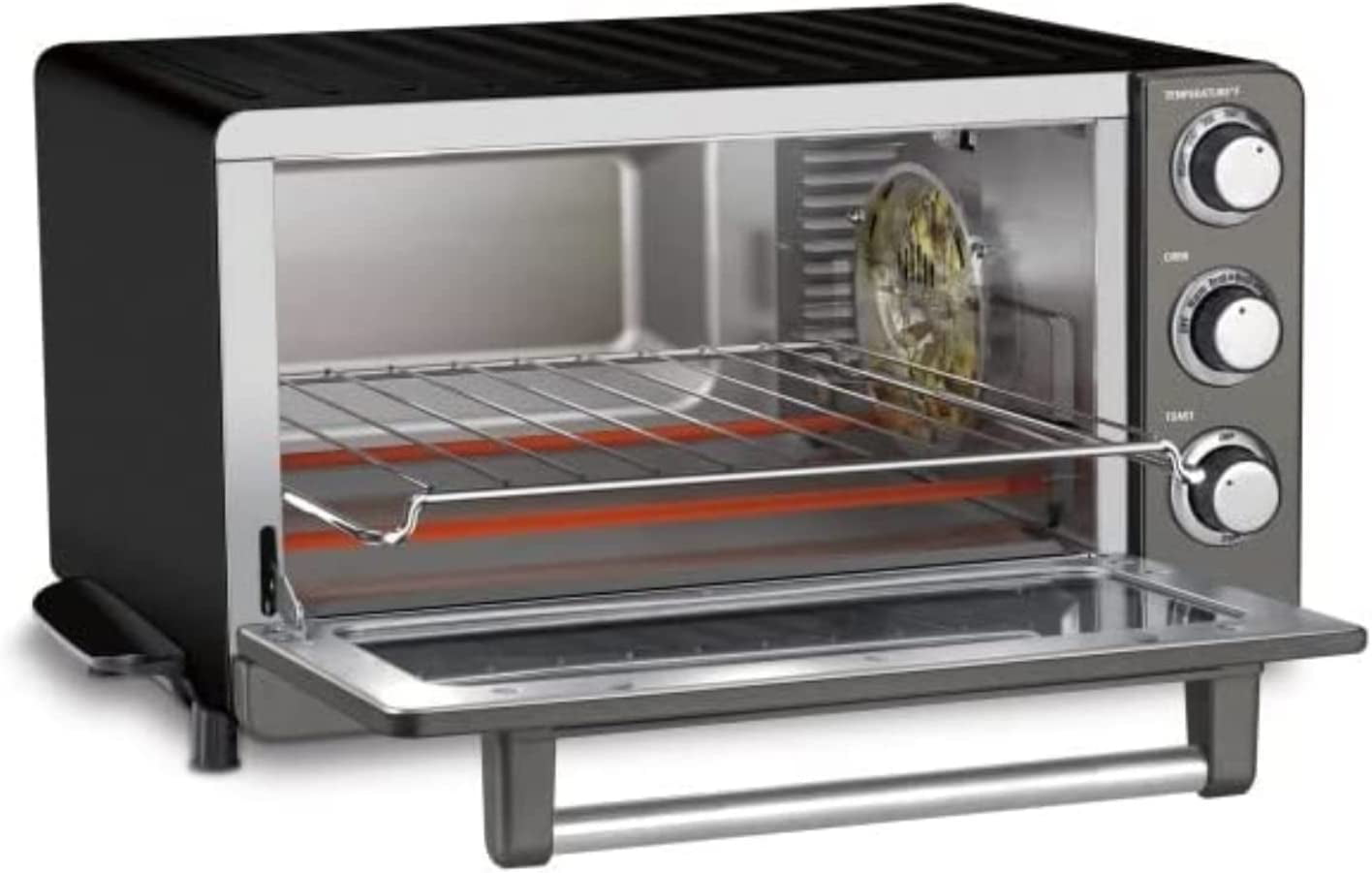 Cuisinart TOB-60N1BKS Convection Toaster Oven Broiler Black Stainless Steel - Certified Refurbished. Cuisinart brings a classic approach to modern cooking with the Toaster Oven Broiler with Convection. The industrial stainless steel styling, and the 0.6 cu ft. capacity – large enough to fit a 12” pizza or 6 slices of toast – make this countertop oven a valuable addition to any kitchen. This multi-functional oven can bake, broil, toast, warm, convection bake and convection broil to perfection with a glass window allowing you to monitor the cooking progress without opening the door. Clean up is easy thanks to the interior nonstick coating and the removable crumb tray..