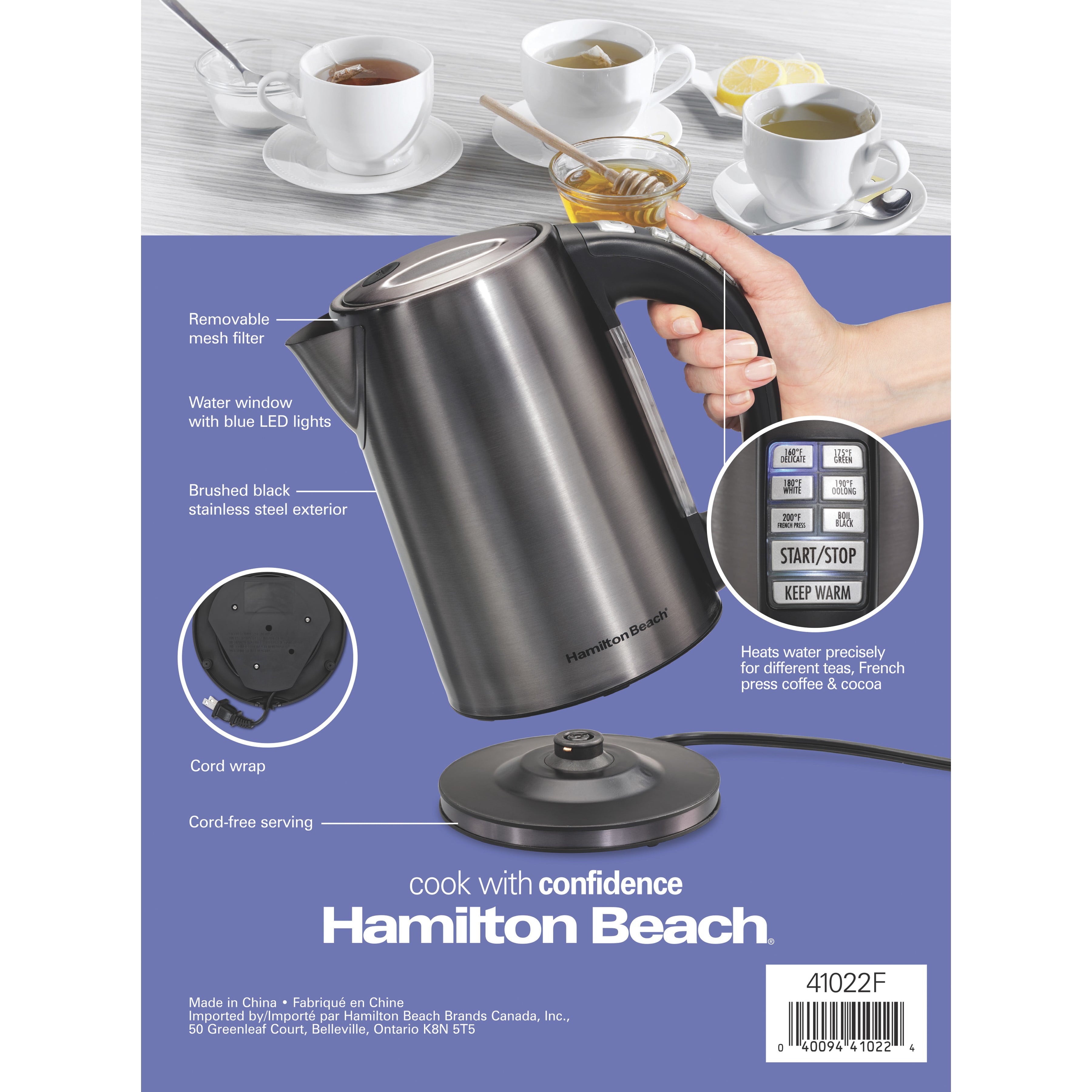 The Hamilton Beach® Variable Temperature Kettle eliminates guesswork with 6 temperature presets for green, white, oolong, delicate herbal teas, and French press coffee. Because it heats water with the touch of a button and reaches precise temperatures, there's no guesswork and you can make your favorite hot beverages with confidence. To hold water at your selected temperature for 30 minutes, press the keep warm button - you'll be able to pour yourself multiple cups without reheating the water. To boil water, simply press the boil preset button and the kettle has 1500 watts of power bringing water to a boil fast. The large water window makes it easy to keep track of the water level, and the blue LED lights look attractive and provide extra light on dark mornings. For peace of mind, the Hamilton Beach Variable Temperature Kettle has an automatic shutoff and boil-dry protection. A convenient cord-free serving makes it easy to pour beverages at the table, and the 1.7-liter capacity holds enough water for the whole family.