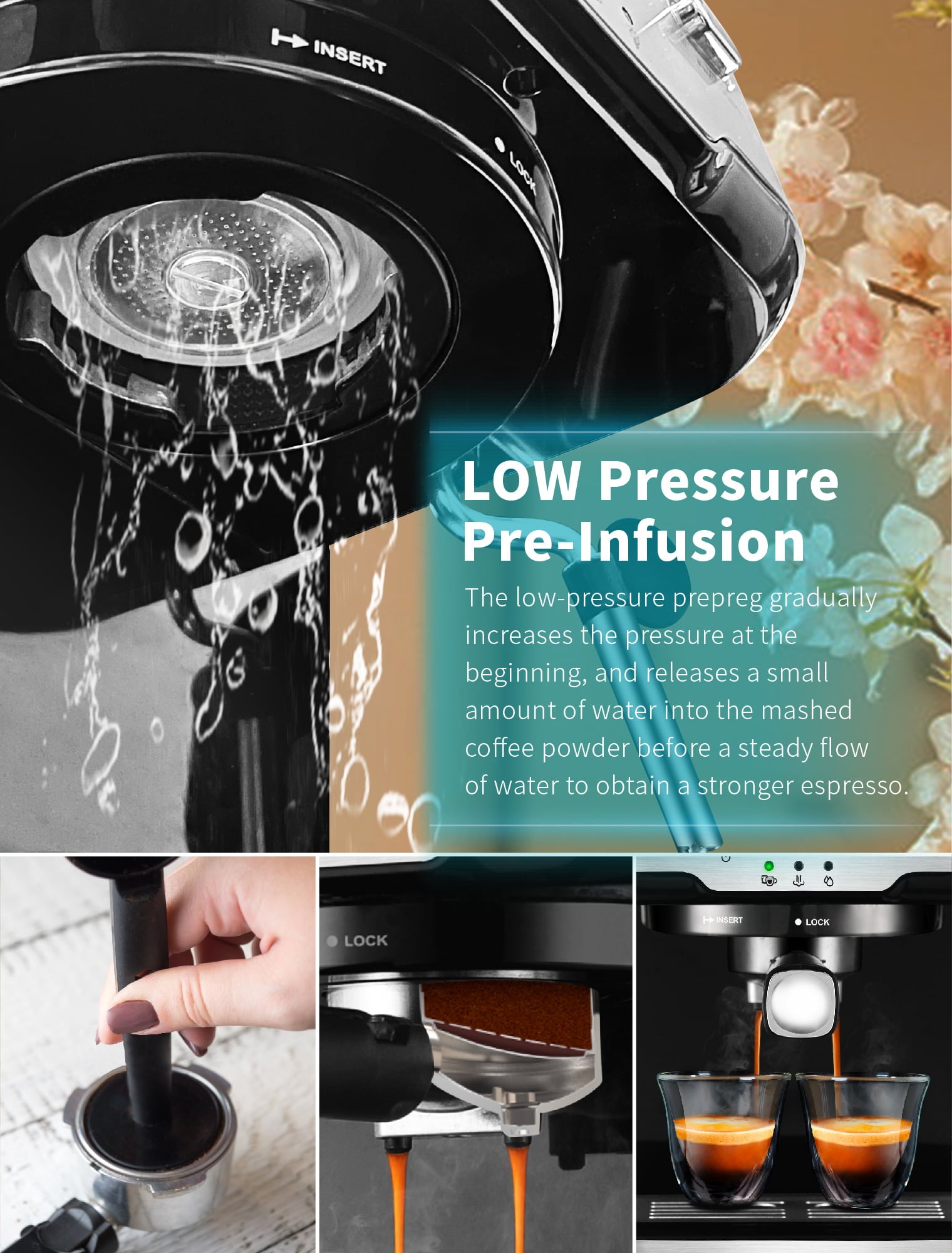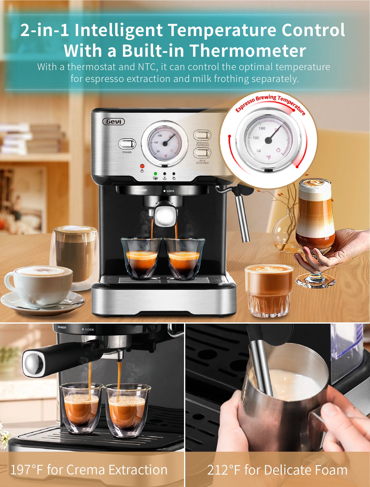Gevi Black Espresso Machine with Milk Frother, 50 oz Water Tank has 15-bar pressure pump which ensures the coffee flavors, maintaining the aroma of the coffee. Expresso Coffee Machine reaches the optimal brewing temperature quickly and keep the coffee in a perfect temperature.