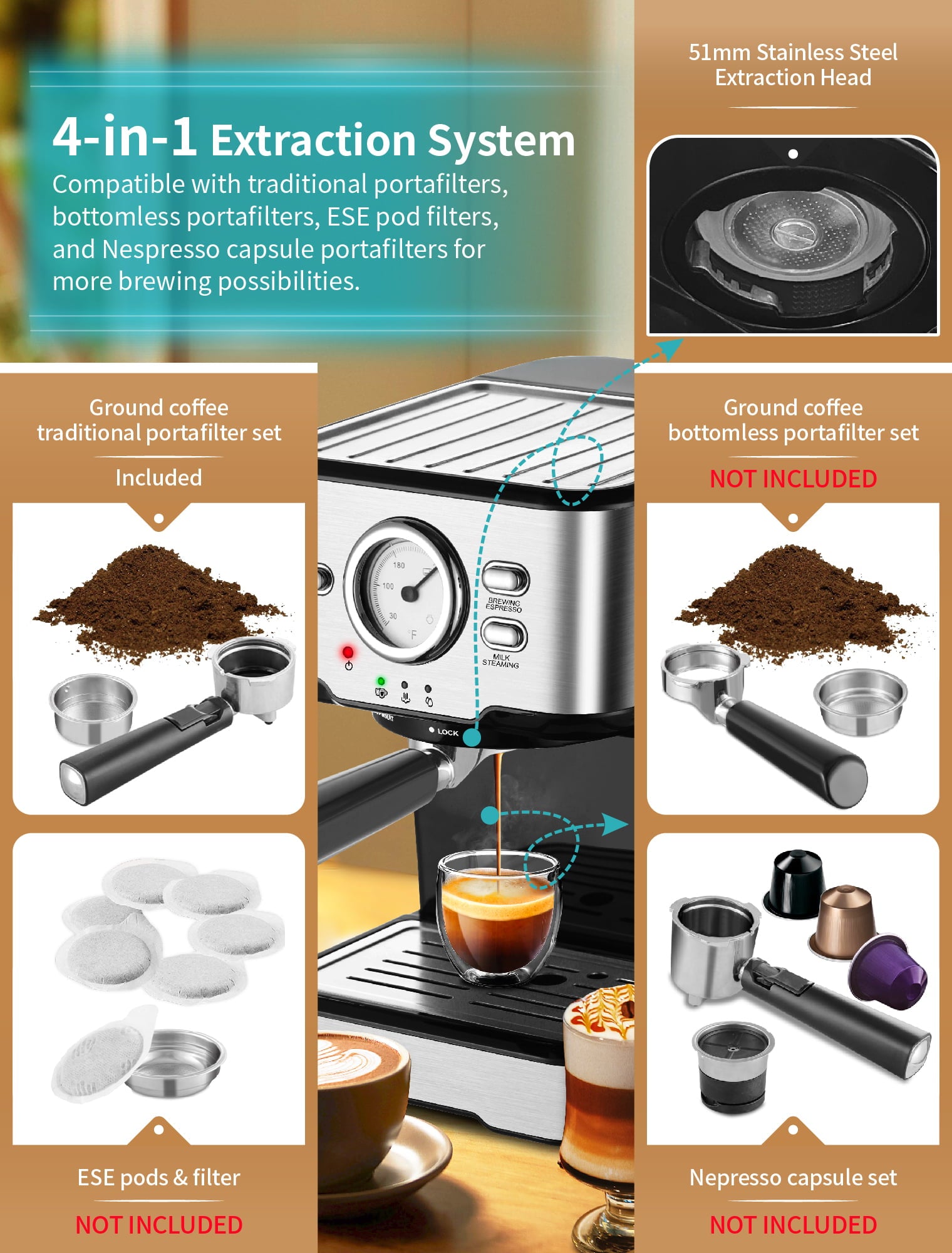 ☕【15 BAR FOR BEST FLAVORS】: Espresso Machine, 15 bar professional Italian pump, with 1100W powerful pressure to extract coffee. NOTE: Turn off by yourself when reaching the desired amount of espresso.