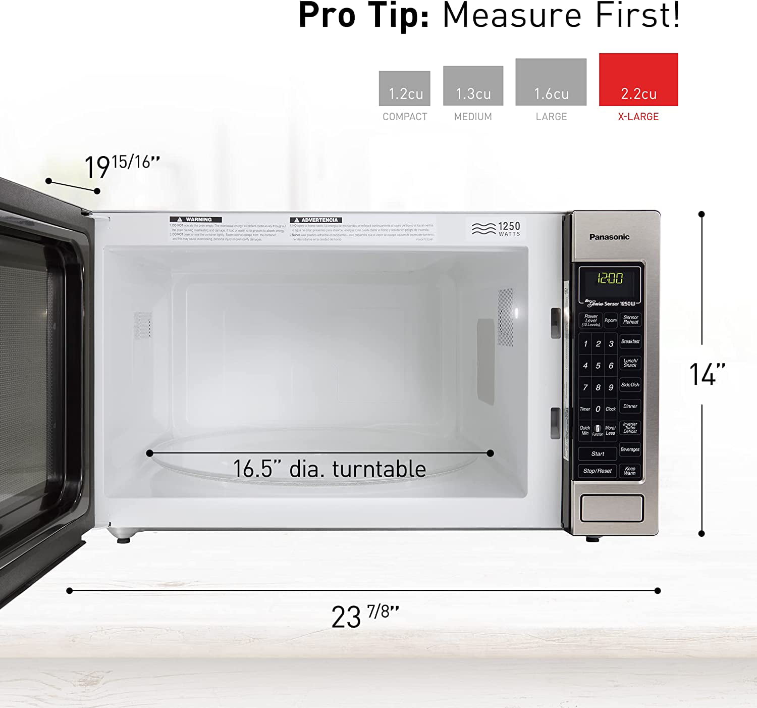 With its sleek, stainless-steel door and base and stainless silver body, the powerful Panasonic Microwave Oven NN-T945SF Countertop/Built-In with Inverter Technology and Genius Sensor makes a stylish and convenient addition to any home, apartment or condo kitchen. This exceptional 1250-Watt, 2.2-cubic-foot capacity stainless steel microwave with 16.5-inch turntable evenly heats and cooks breakfast foods, after-school snacks, dinners, appetizers and more, making it ideal for singles, busy professionals and on-the-go families. This innovative microwave oven includes patented Inverter Technology which, unlike traditional microwaves that rely on pulse-on, pulse-off power at lower temperatures, delivers a constant stream of cooking power at every temperature for more evenly cooked meals - edges to centers - every time. With the touch of the Genius Sensor cooking button, this microwave takes the guesswork out of creating a great meal by automatically setting power levels and adjusting cooking or defrosting time for added time-saving convenience. The sensor measures the amount of steam produced during cooking and signals the microprocessor to calculate the remaining cooking time at the appropriate power level. A selection of 14 auto cook options enable you to quickly prepare your favorite foods, such as pizza, popcorn, pasta, soup, oatmeal and other dishes. This Panasonic microwave oven externally measures 14-inch x 23-7/8-inch x 19-7/16-inch (H x W x D).