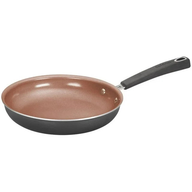 Cookware?s aluminum core heats quickly and evenly. Exclusive titanium-reinforced ceramic nonstick interior for enhanced food release and durability. Nonstick will not stain or discolor. PTFE, PFOA and PFOS free. Silicone handles are riveted for strength and durability. Contoured for a secure grip and designed to stay cool on the stovetop....