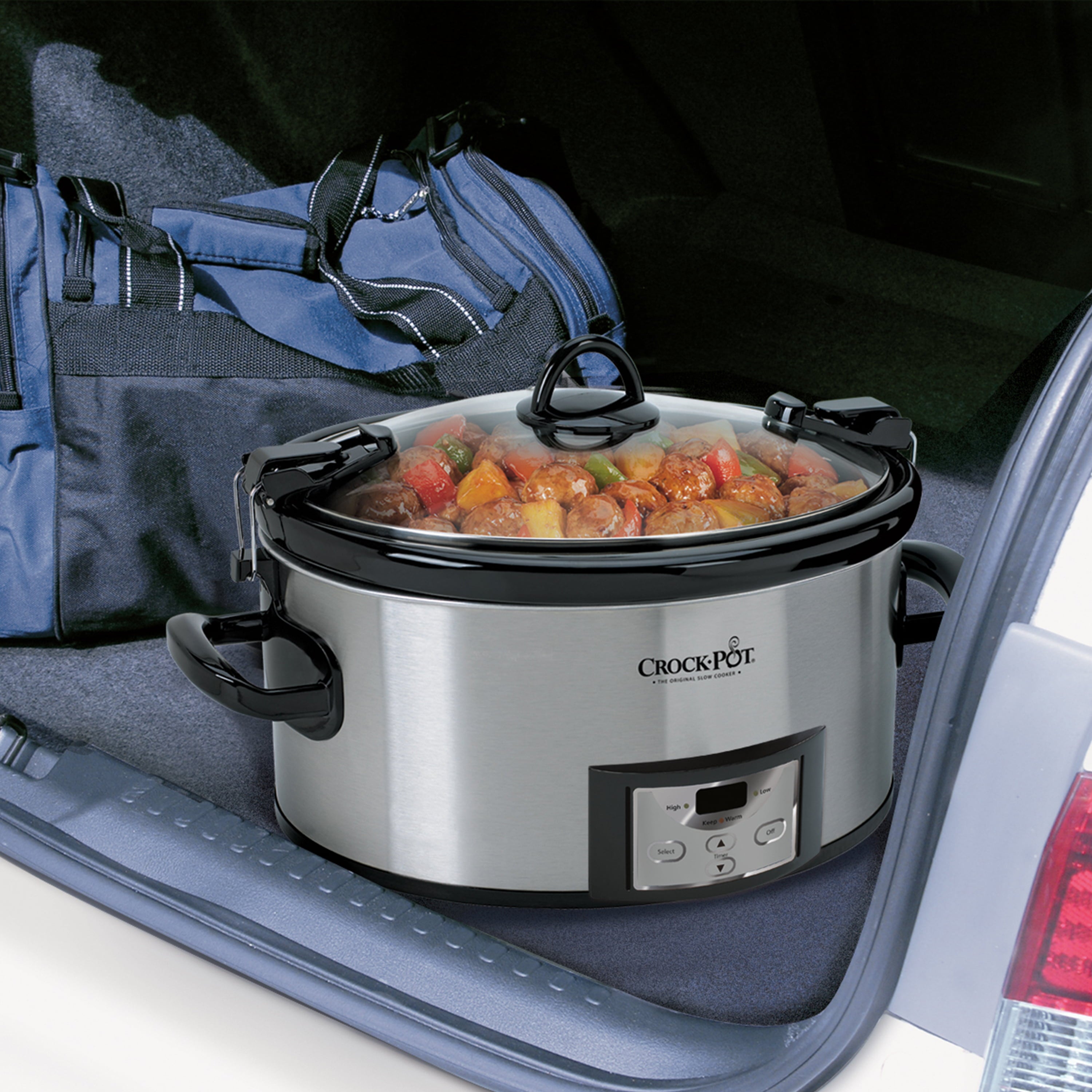 The Crock-Pot 6 Quart Programmable Cook & Carry Slow Cooker with Digital Timer is made for portability. Its secure locking lid and rubber gasket create an airtight seal, helping to prevent spills on the road; food stays inside, and you arrive at your destination without any worry or mess. Bring this portable slow cooker to potlucks, family gatherings, tailgating, parties, and more. The digital panel allows you to customize your cooking time between 30 minutes and 20 hours and set the temperature on high, low, or warm setting. After cooking is complete, the slow cooker will automatically shift to warm for up to 6 hours to help maintain food temperature and flavor. With dishwasher-safe components, this is the perfect digital slow cooker just about any time you need to transport food prepared at home. With the included recipes you can delight your friends and family with delicious food that's a snap to make.