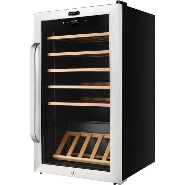 Keep all your favorite wines at their ideal temperature with the 34 Bottle 5 Shelf Dual Zone Stainless Steel Wine Refrigerator from Whynter. This built-in wine refrigerator has 5 removable wooden flat slide-out shelves that can store up to 34 standard bottles of wine so you can enjoy your favorite drink anytime. Additionally, a wire display shelf lets you showcase 5 opened bottles to keep them visible at a glance. A sleek black cabinet and stainless steel trimmed glass door allow you to place this refrigerator with built-in cabinets or used it as a freestanding appliance. With a protective coated tempered double pane glass door, this stainless steel fridge protects your wine from the sun's rays to keep them fresher longer. This fridge features a luxurious curved handlebar to easily open and shut the door. With a powerful compressor and internal air-cooled system, this refrigerator keeps all your wines at a consistent temperature. With a stylish design, this 34 Bottle 6 Shelf Dual Zone Wine Refrigerator from Whynter is ideal for keeping all your favorite wines cool and ready to drink.