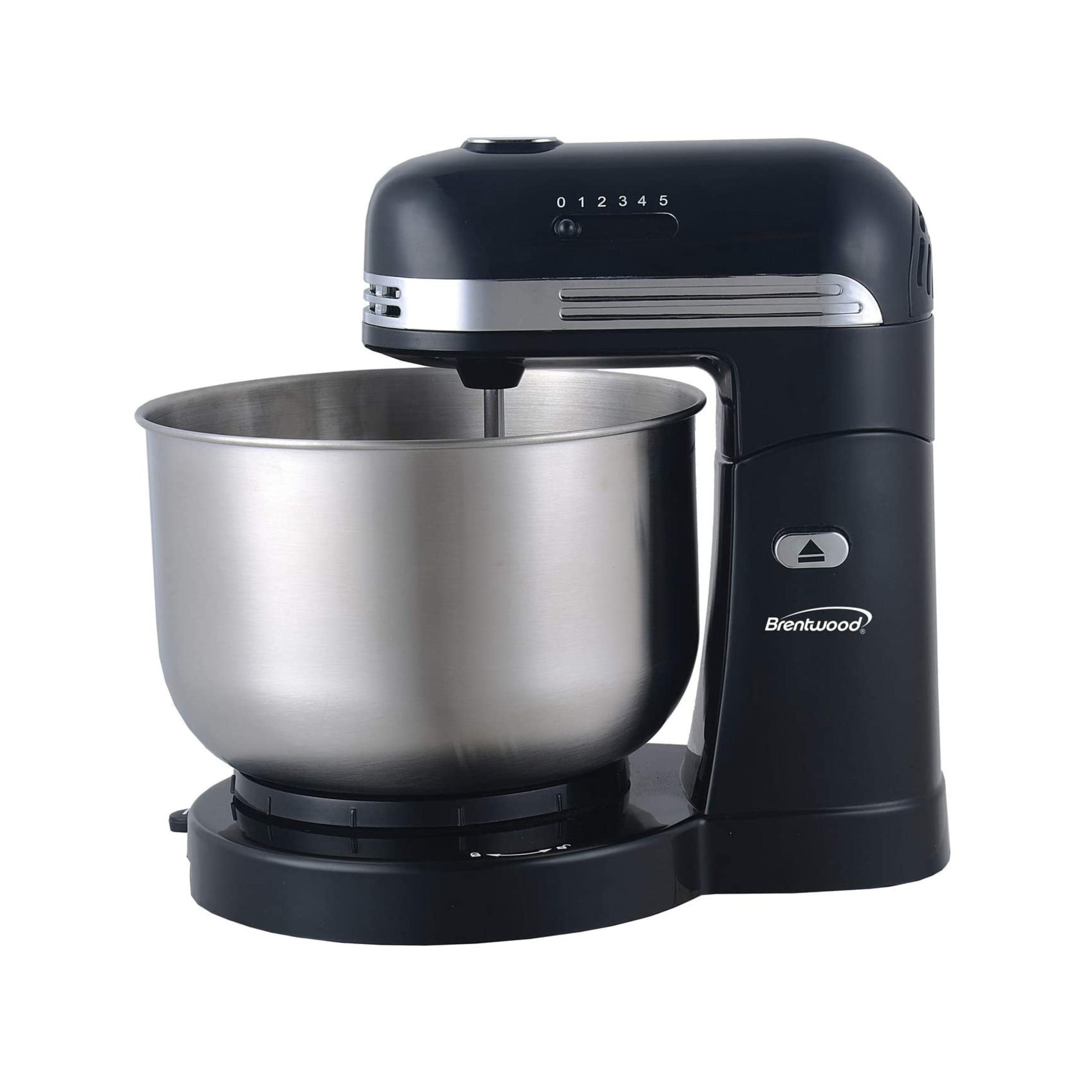 Use the Brentwood SM-1162BK 5-speed stand mixer with 3.5 Qt stainless steel mixing bowl to easily beat eggs, whip cream, mix batter and more. Control speed and eject beaters with one hand. Includes dishwasher safe chrome plated beaters and dough hooks.