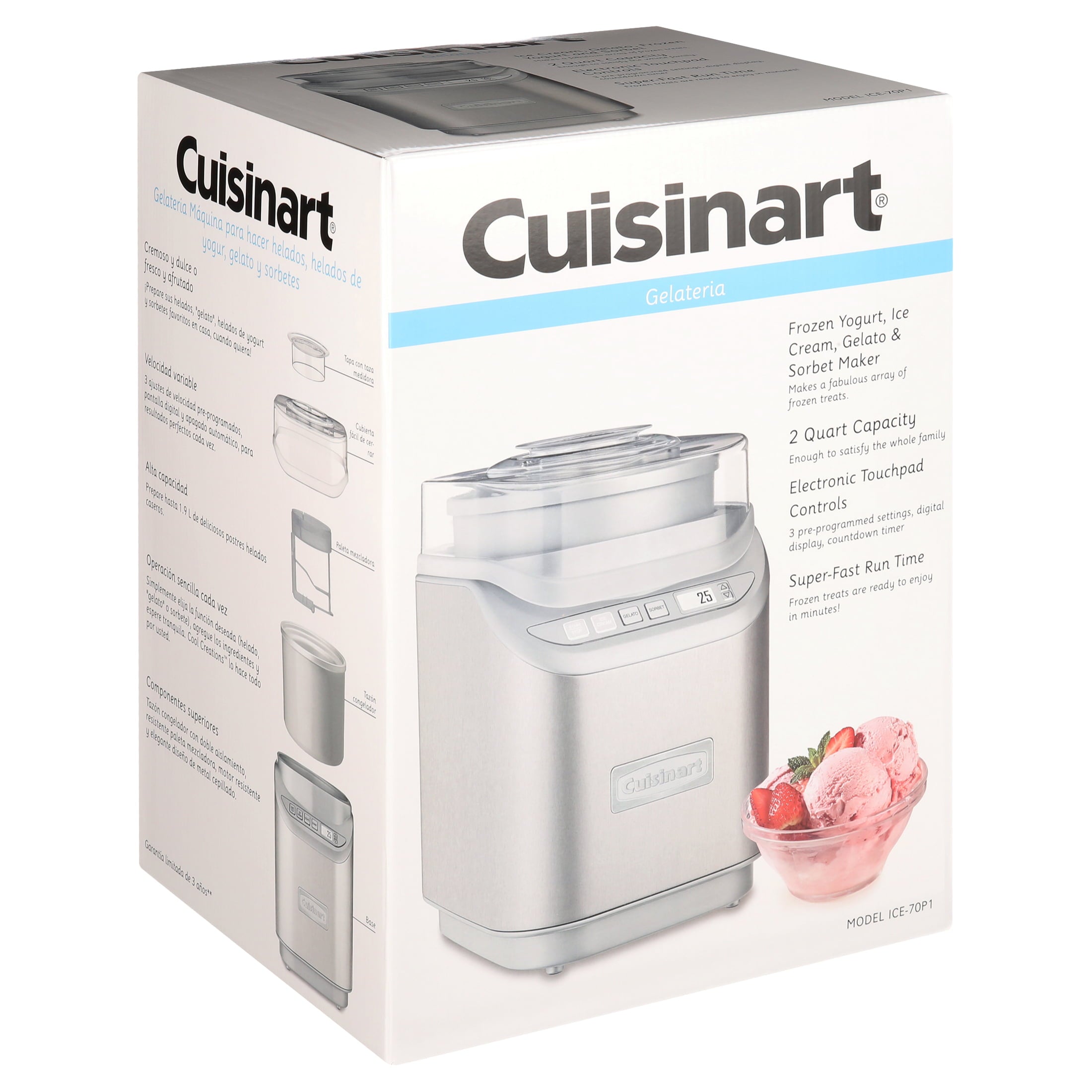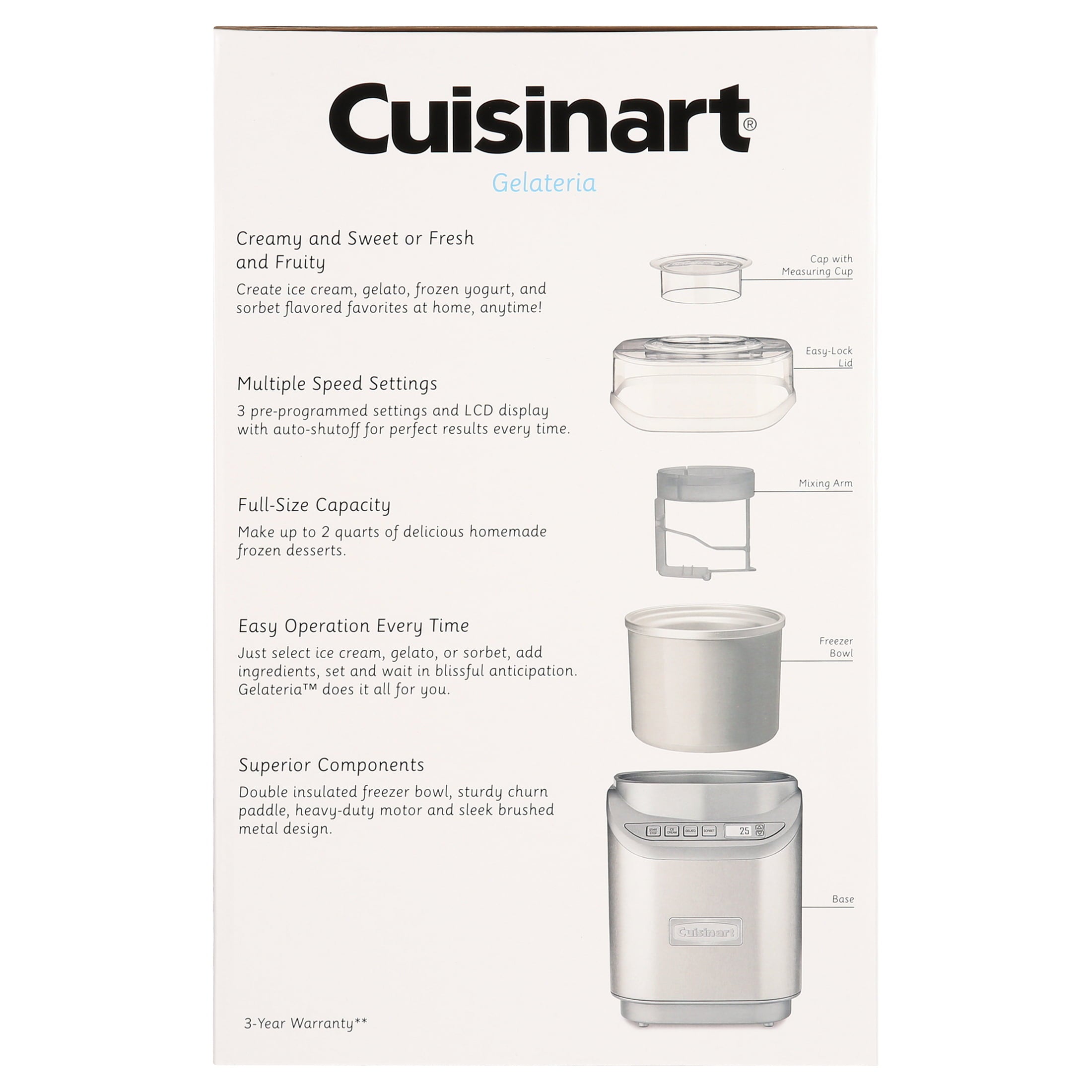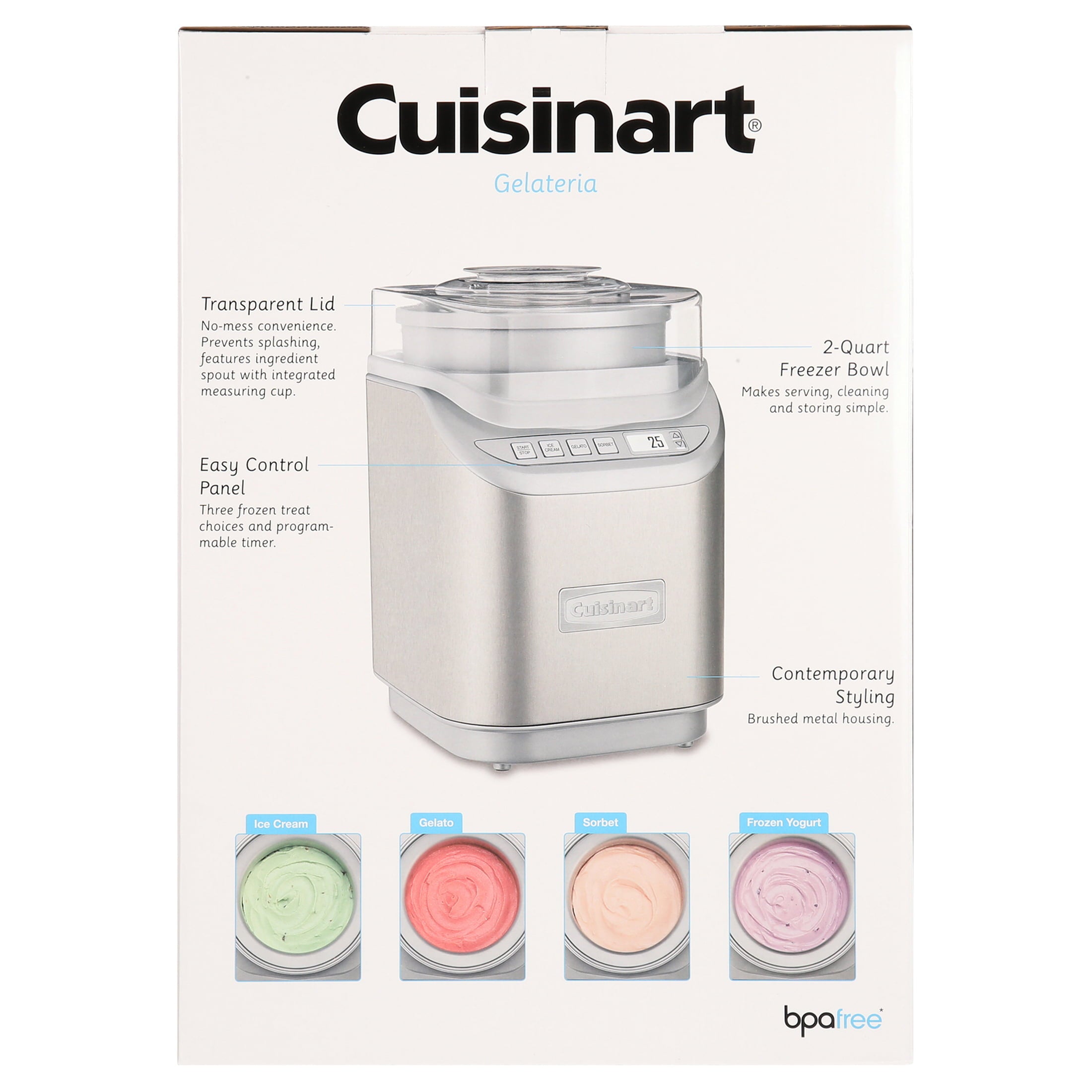 At the touch of one button, you can create two quarts of delicious frozen treats with the Cool Creations™ Ice Cream Maker in just 20 minutes. Making homemade ice cream, gelato, frozen yogurt, and sorbet of any type in any flavor couldn’t be easier with one-button operation for ice cream, gelato, and sorbet, convenient LCD time programming, and auto shutoff. The unique paddle makes fast work of processing. The sleek brushed metal housing makes it look as good as the treats it creates for your family and friends.