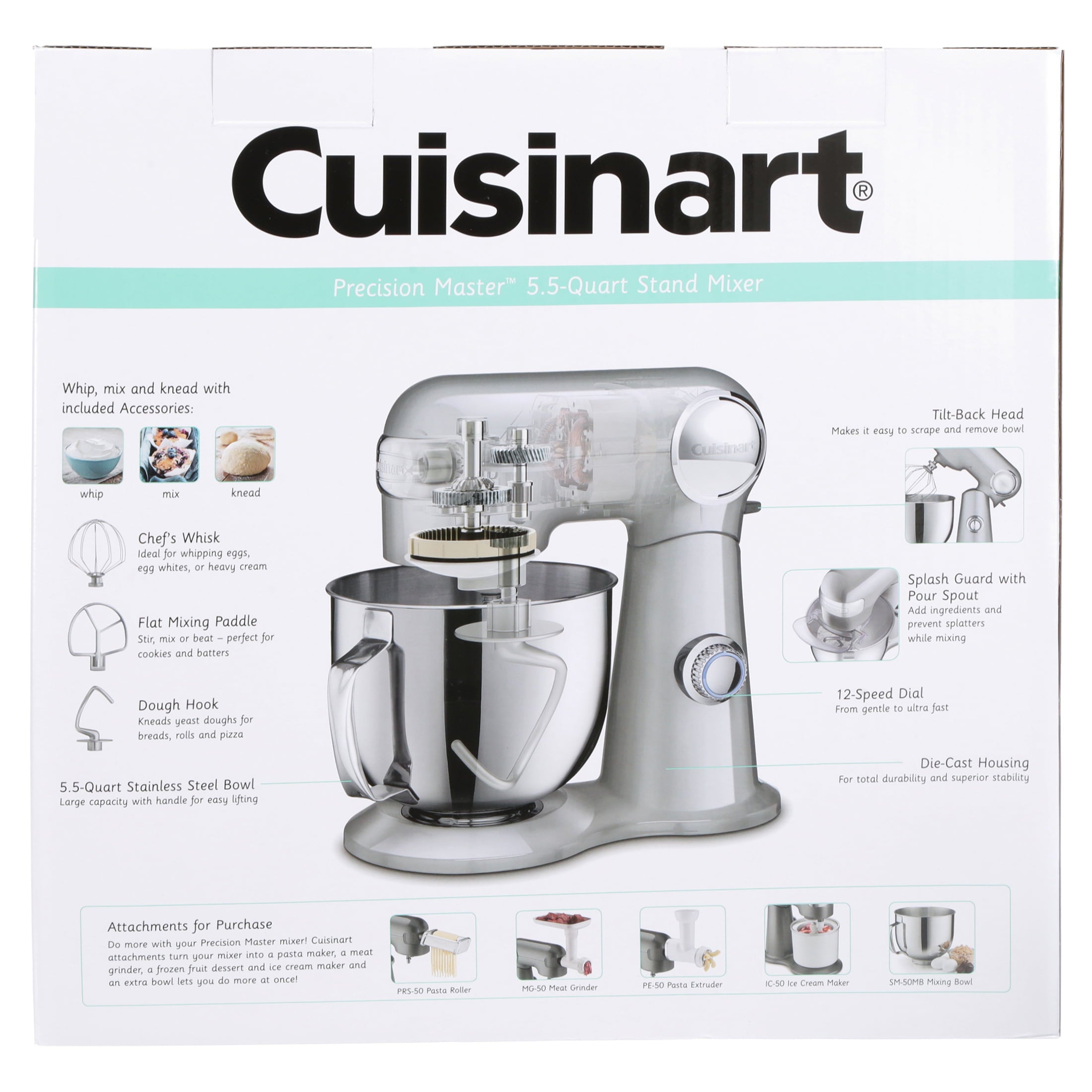 Make kitchen tasks easier and complete numerous favorite recipes with the Cuisinart Precision Master 5.5 Quart Stand Mixer. With a 500W motor and die-cast metal construction, it's a durable and powerful appliance. Use the rotating dial on the side to choose from 12 mixing speeds and get the power level you need for a range of applications. With a tilt-back head, this kitchen mixer offers easy and convenient access to the polished steel moving bowl so you can add ingredients or mix by hand as needed. There's also an included splash guard to help prevent messy countertops. A selection of attachments is included, such as a chef's whisk for lighter materials, a hook for bread dough. These as well as the bowl are all dishwasher safe for easy cleaning. The Cuisinart stand mixer also has a power outlet where you can connect optional attachments such as a meat grinder, a pasta roller, and cutter, or a frozen dessert maker (available separately). Choose from a variety of colors to match your kitchen decor.