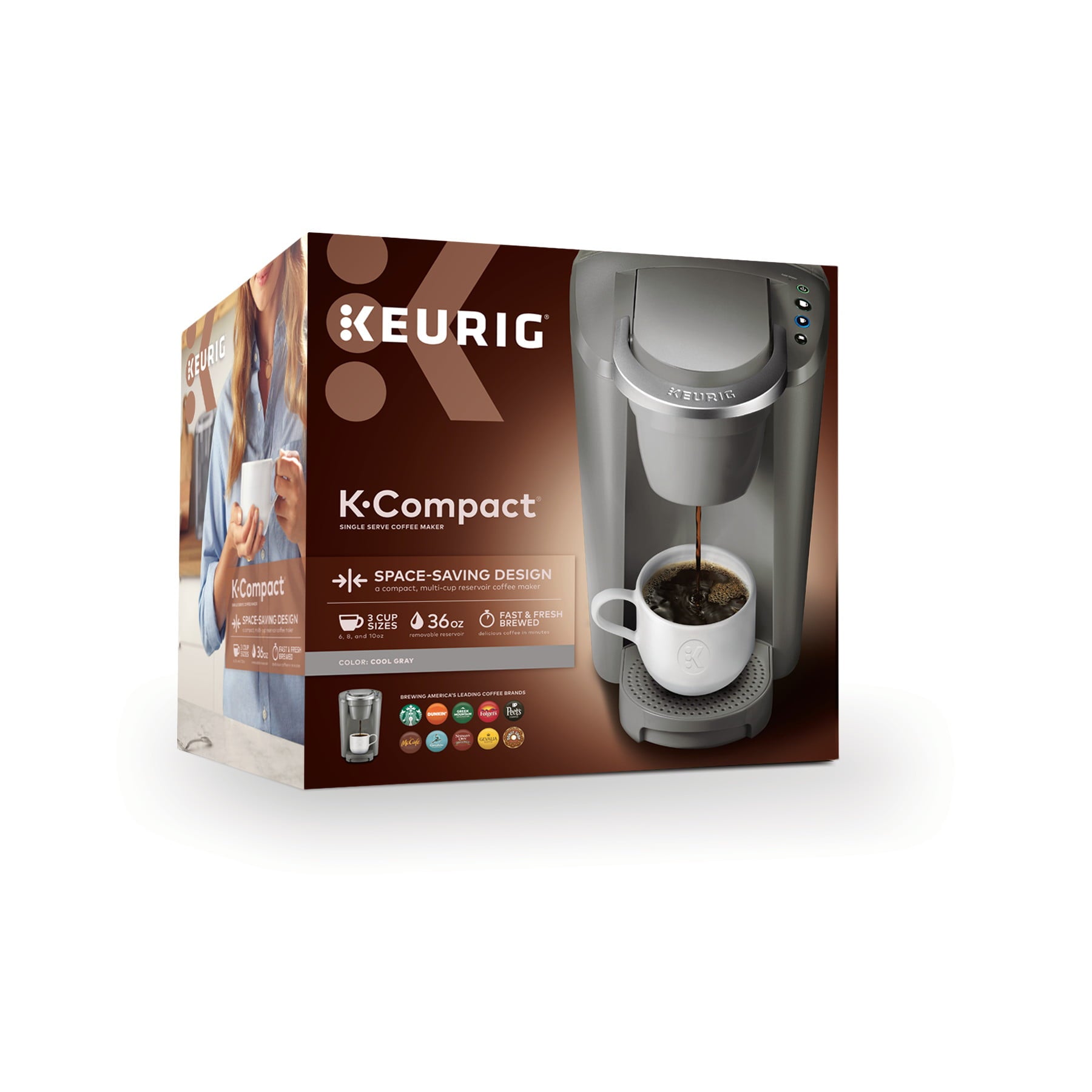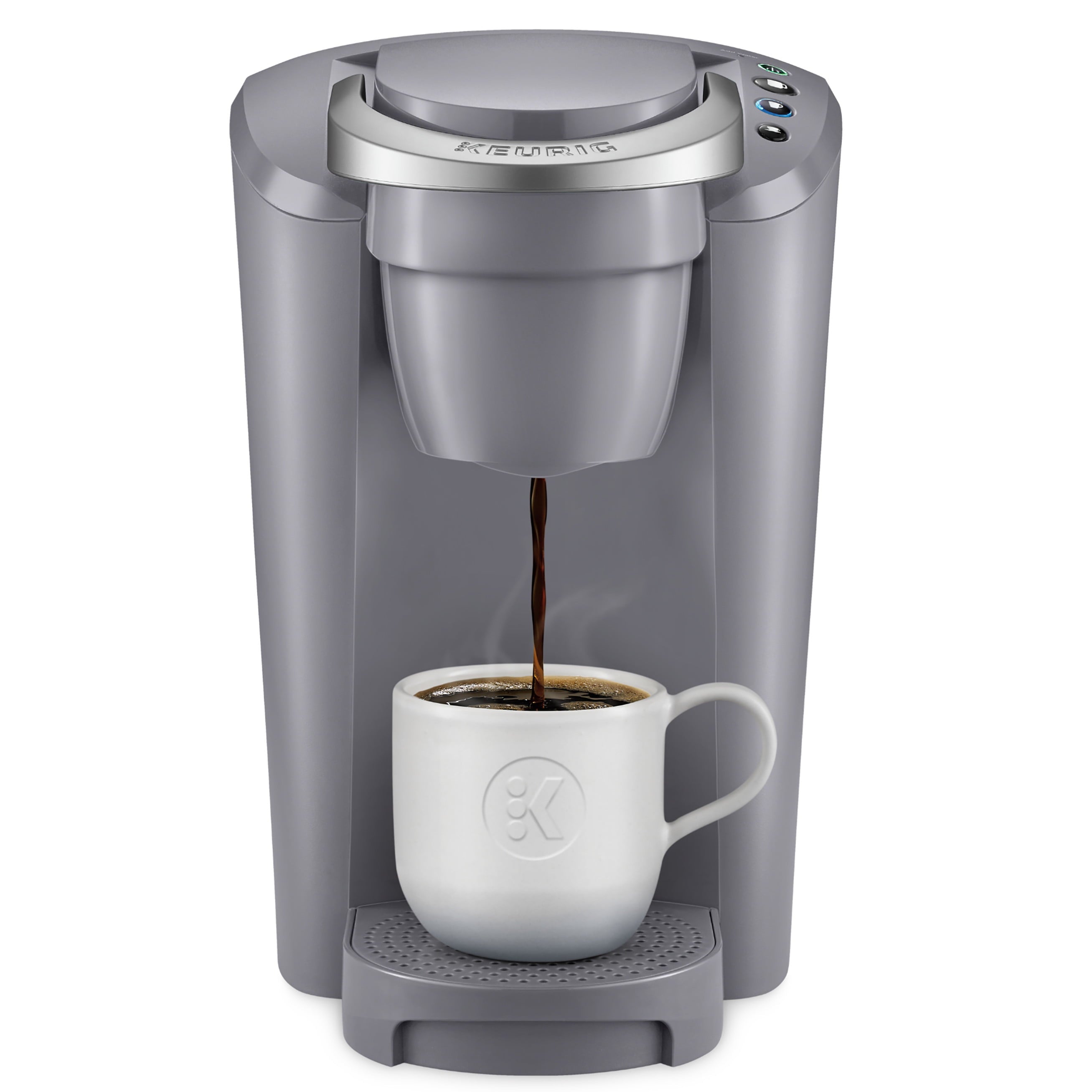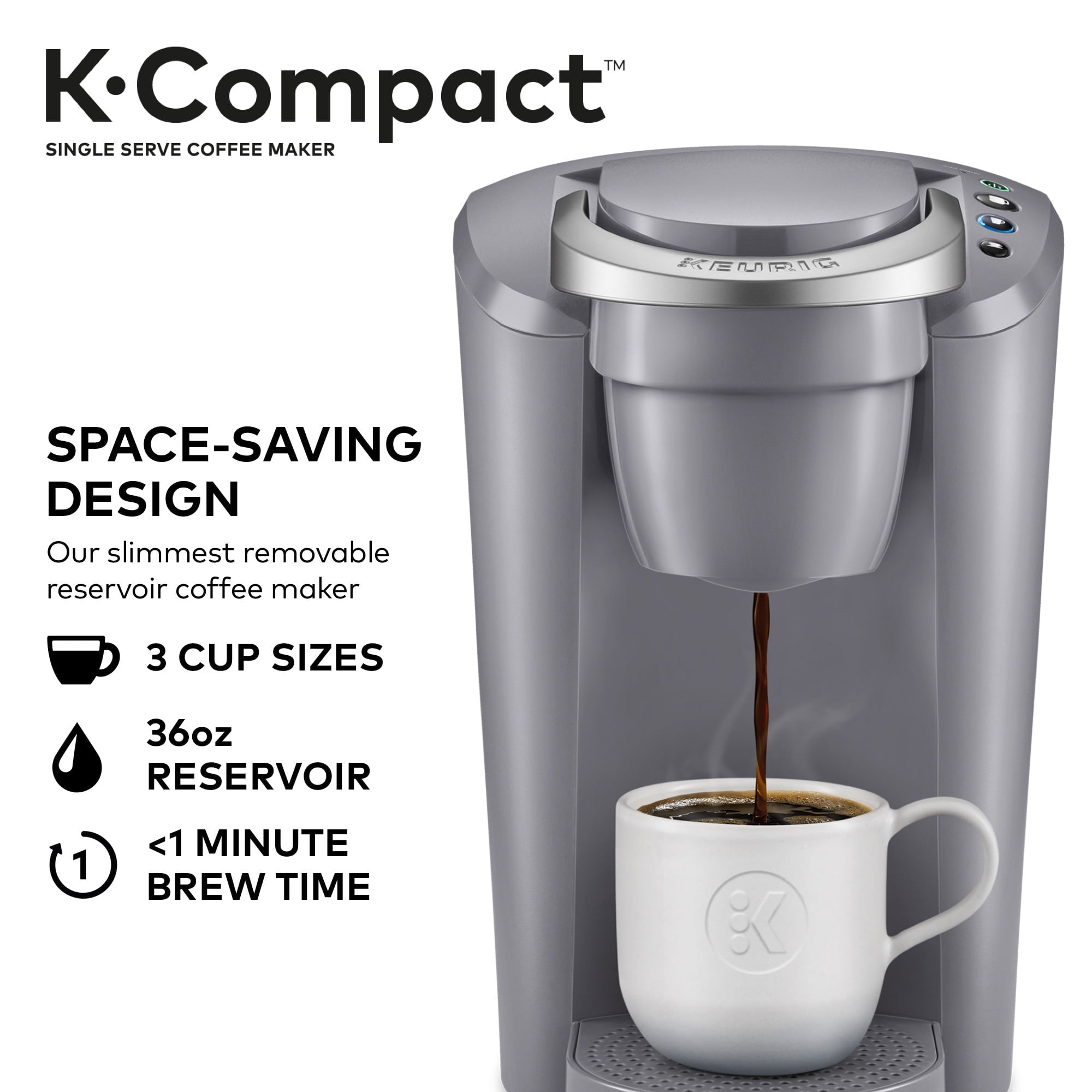 Space saving. Crowd-pleasing. The slender and stylish Keurig K-Compact single serve coffee maker offers consumers a space-saving design to fit their countertop, but still delivers the delicious taste and unparalleled convenience that the Keurig brand is known for. Designed to leave the smallest footprint possible, the Keurig K-Compact brewer in Moonlight Gray is just over 8 inches wide, leaving you plenty of space on your countertop without sacrificing a thing. Brew 6, 8, or 10 oz. of your favorite beverages in under a minute. Choose from hundreds of delicious K-Cup pod varieties coffee, tea, hot cocoa, iced beverages, and more and enjoy a perfect cup, every time. Or brew your own ground coffee with the Keurig Universal My K-Cup Reusable Coffee Filter (not included). The Smart Start feature heats and then brews in one simple process for even more convenience. The K-Compact brewer has a removable drip tray to accommodate travel mugs, and its 36 oz. removable water reservoir allows you to brew multiple cups before refilling.