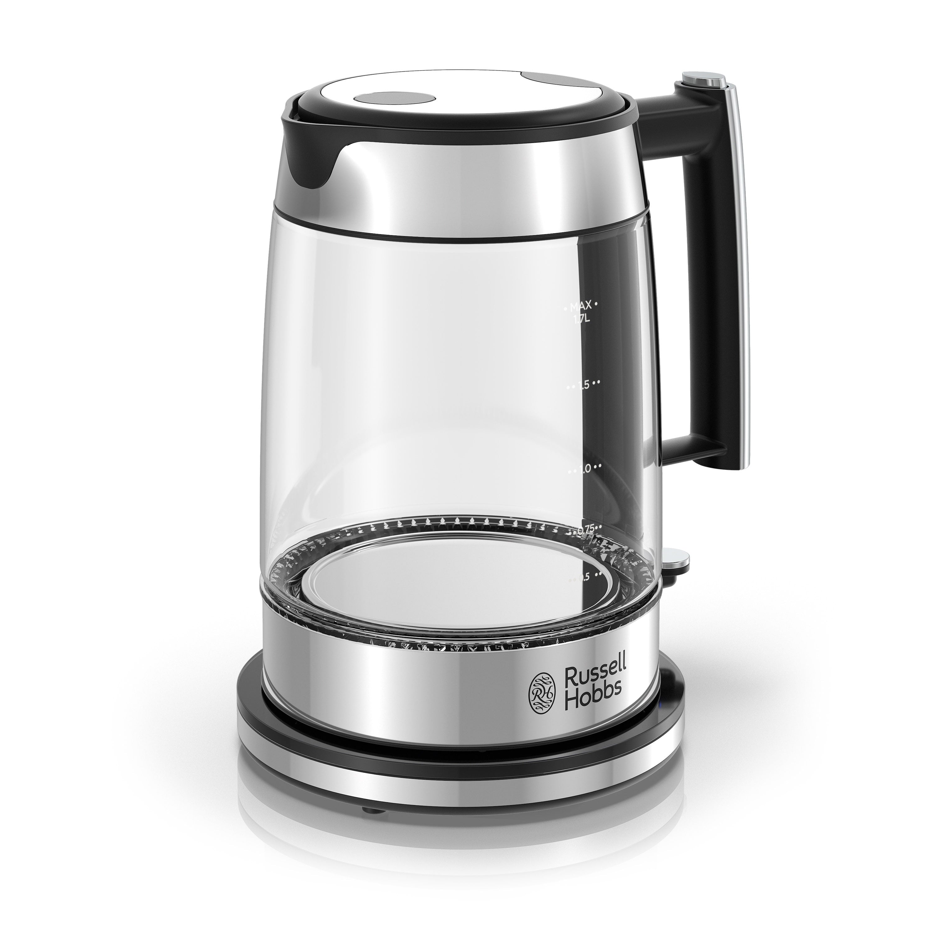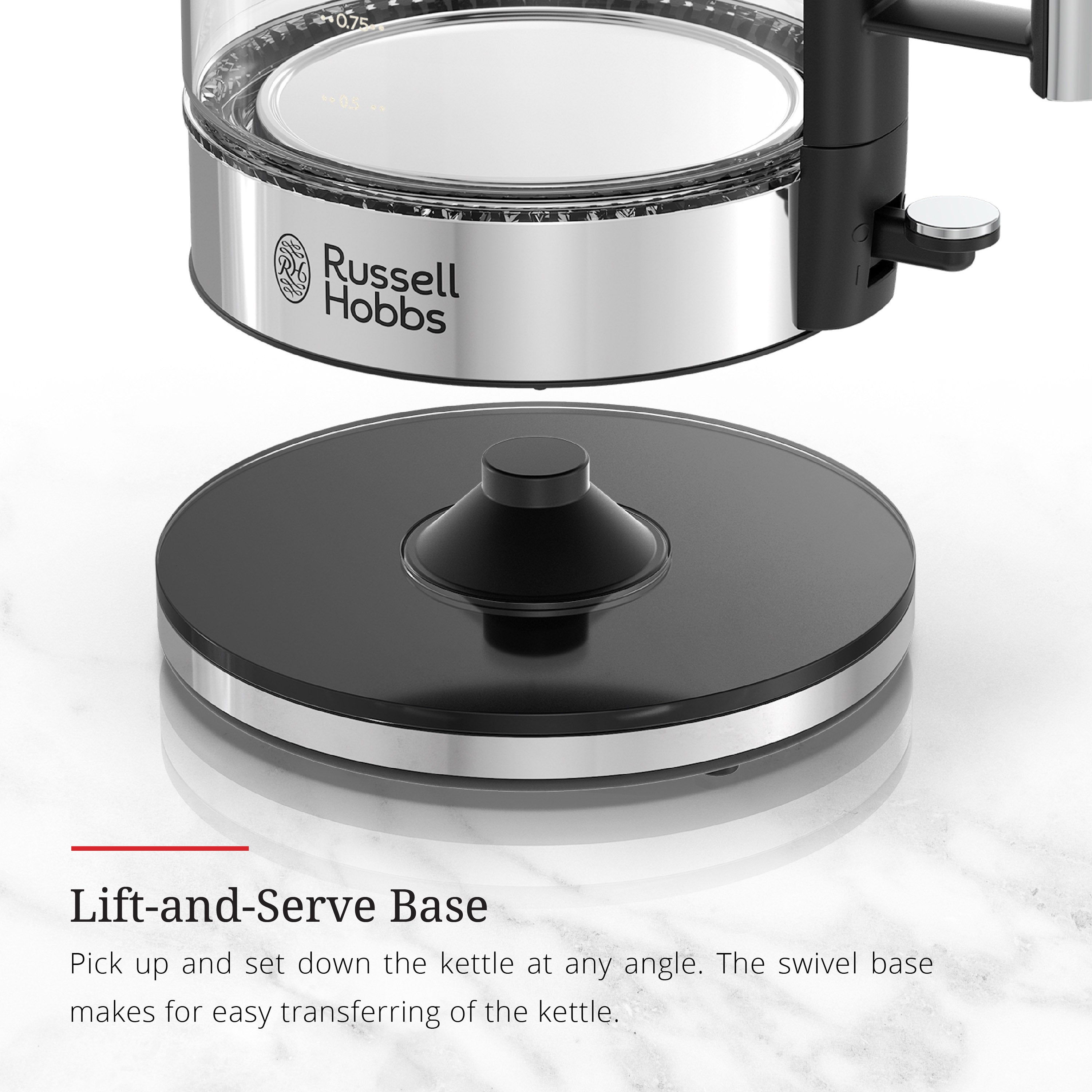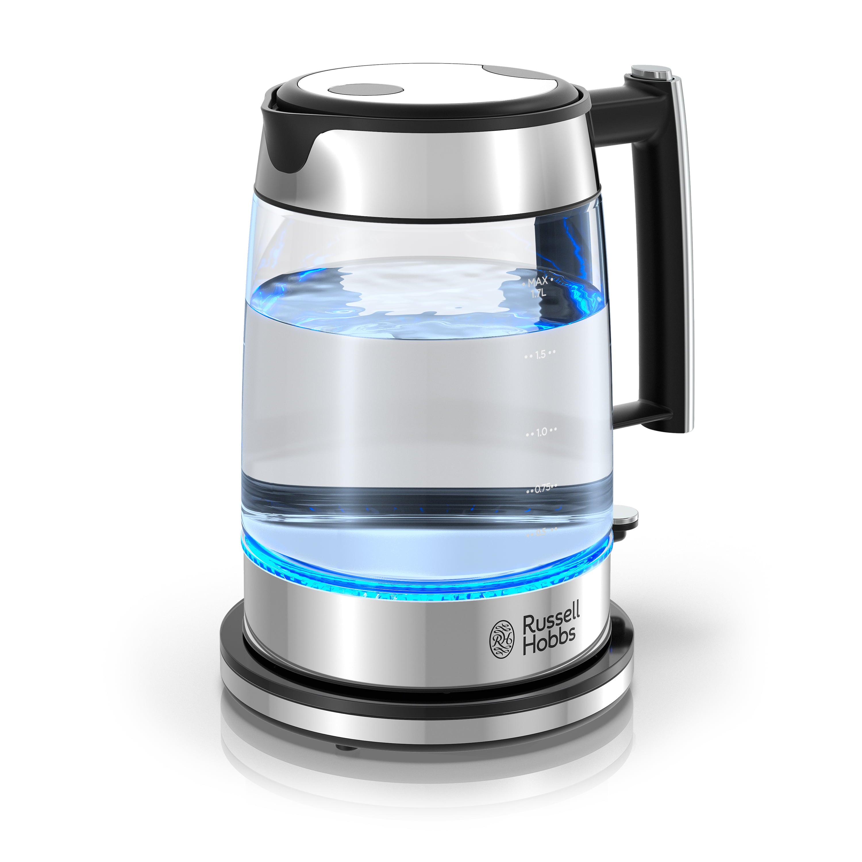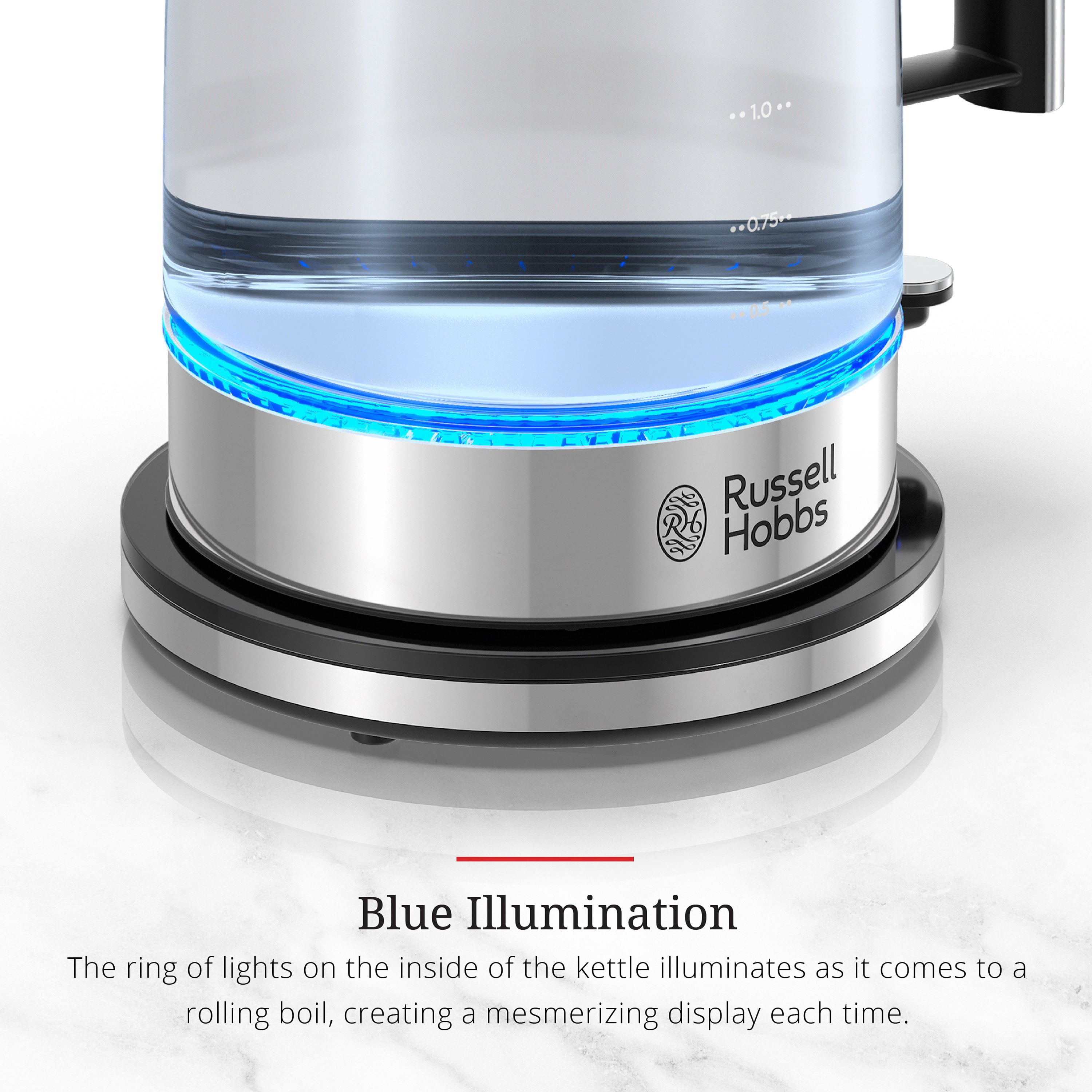 The process of bringing water to a boil may be as old as time, but that doesn?t mean your kettle has to be. The RUSSELL HOBBS Glass Electric Kettle features eye-catching blue LEDs that illuminate while water boils, offering an ultra modern feel to a more efficient method of boiling...