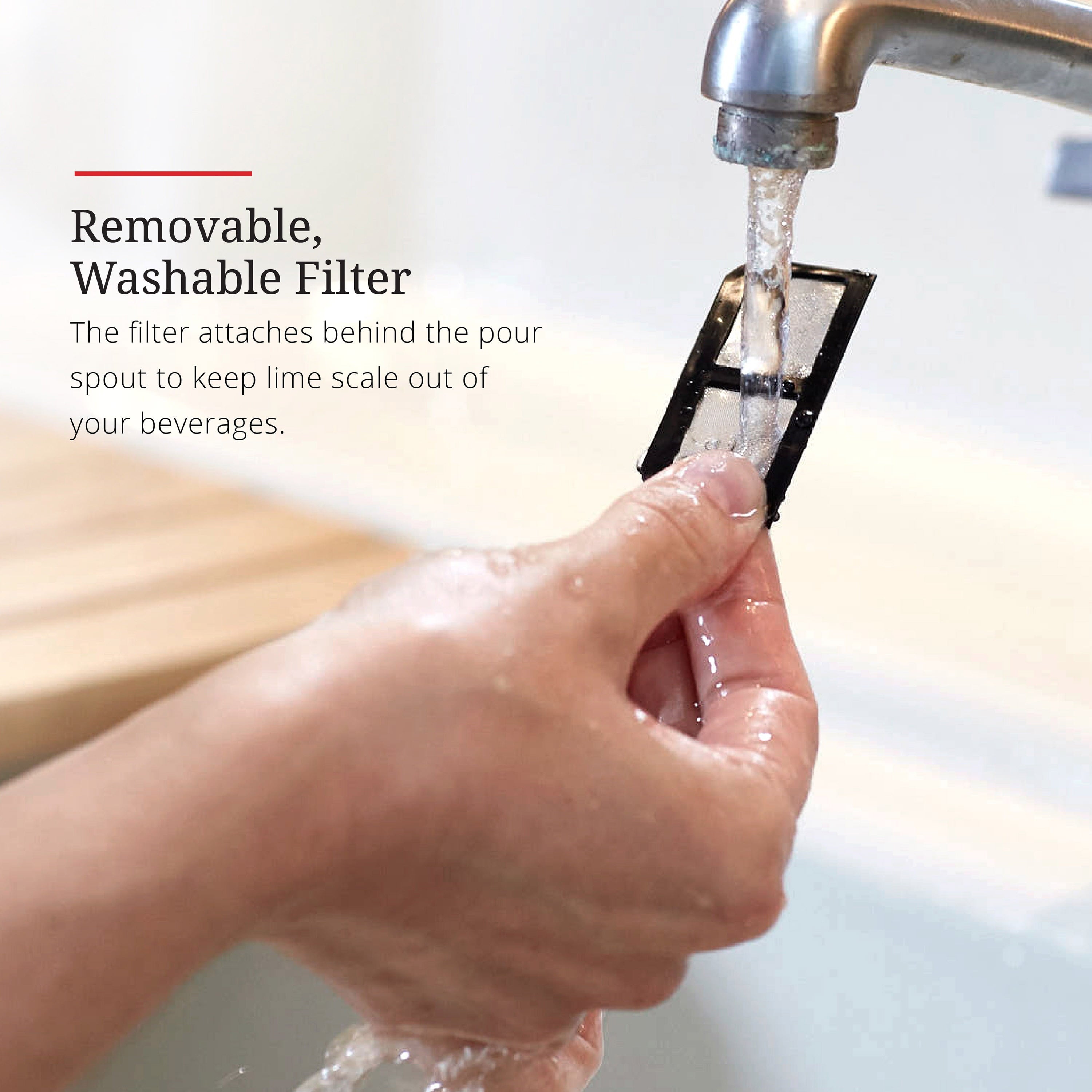 - Removable, Washable Filter - The filter attaches behind the pour spout to keep lime scale out of your beverages. Removable for easy cleaning.